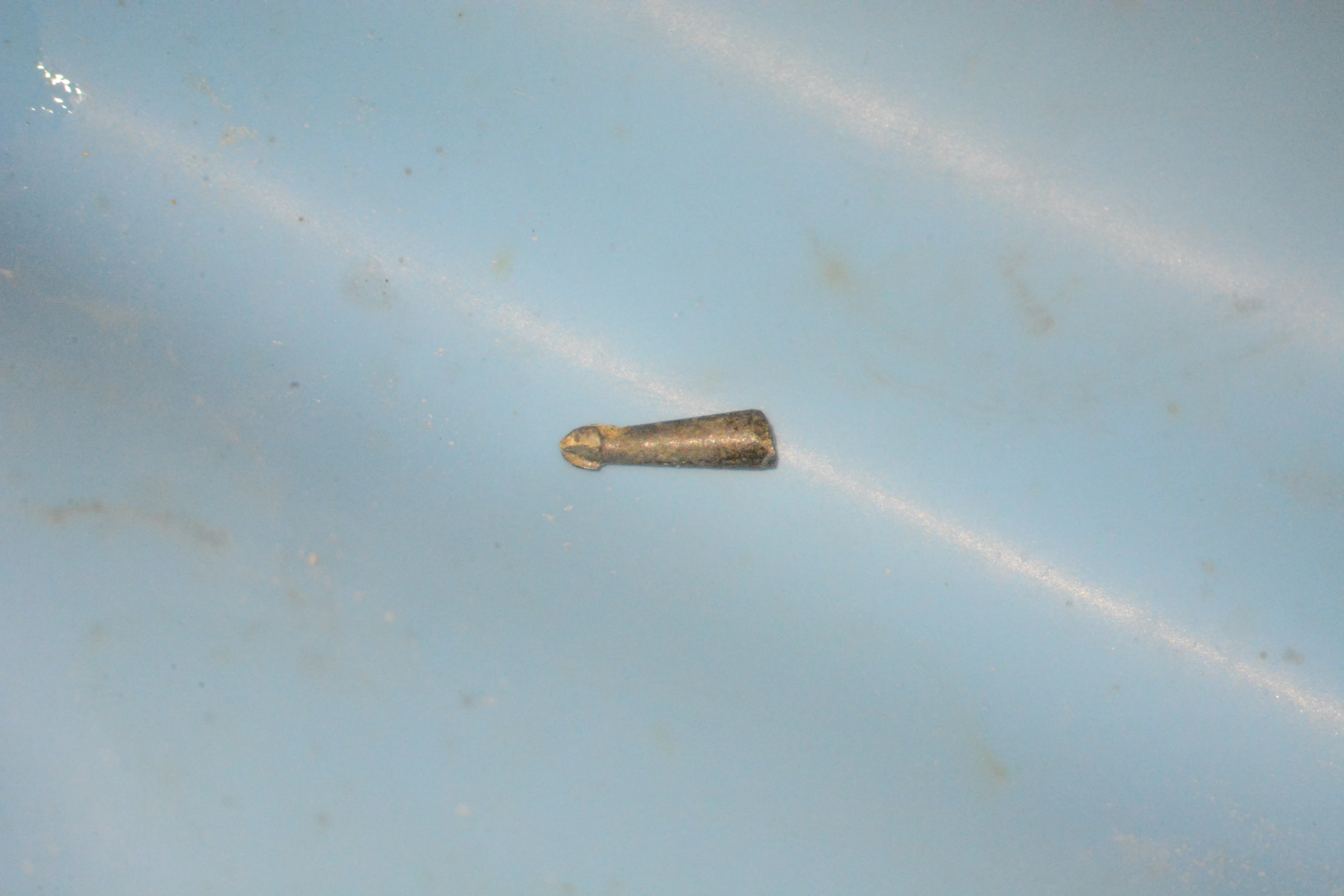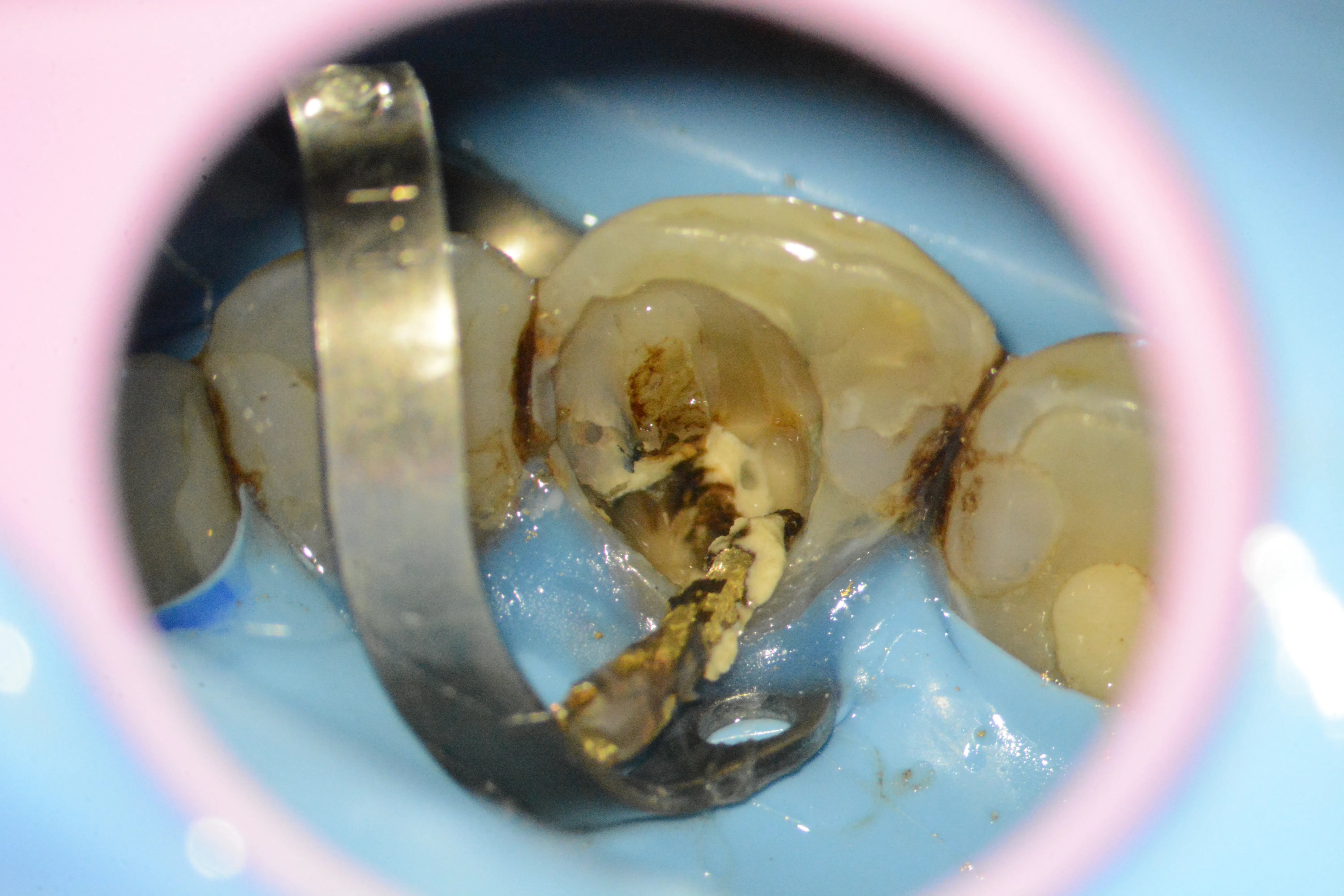 3 – Aspectul pivotului metalic după eliberarea din partea coronară și resturi de ciment cu carie secundară